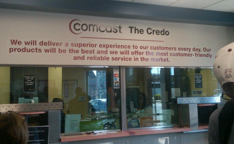If my eyes were lasers, the large Comcast Credo sign over the service counter would be smoldering cinders.  The sign proclaims Comcast’s “superior … customer-friendly” service.  I realize that it is a gazillion times less ironic than the “Work Will Make You Free” sign over the entrance to Auschwitz, but I’m in no mood to let that make me feel better.