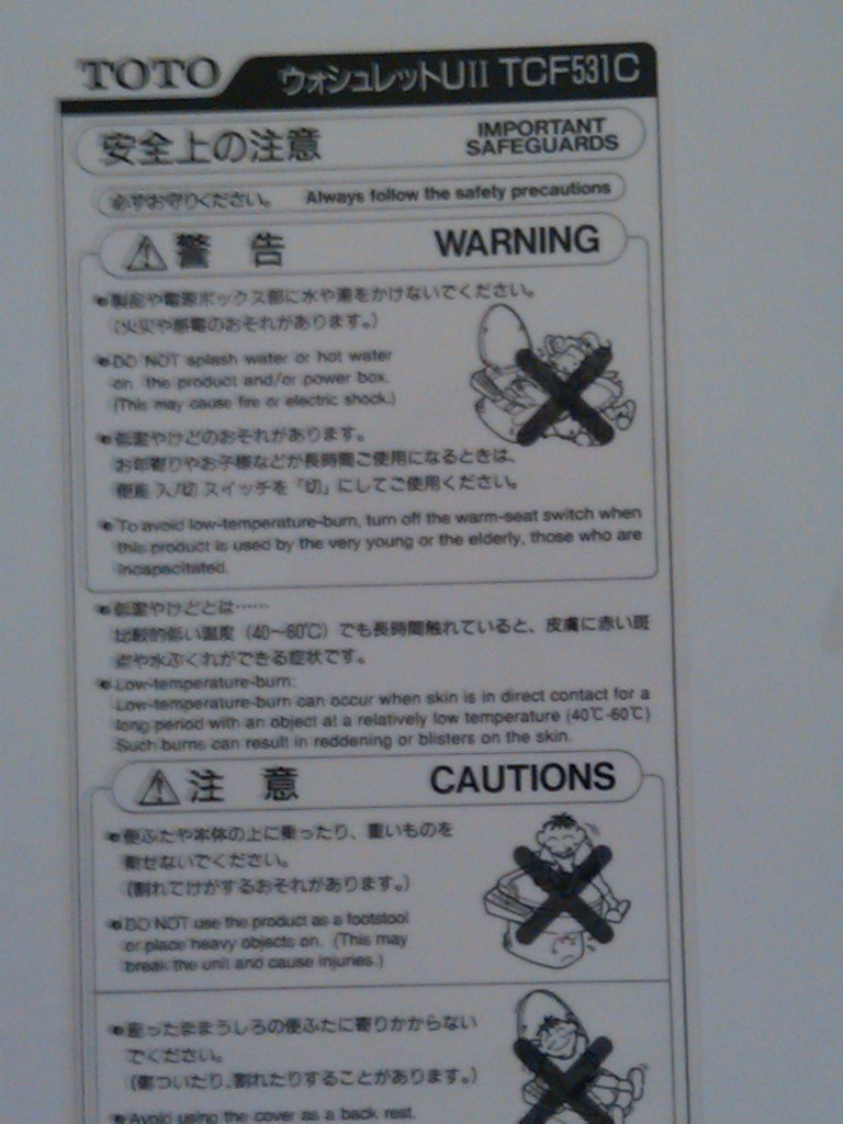 Although my husband has cooled his heels waiting for me outside ladies rooms in airports all over the world, he could not imagine what was taking me so long. I had to explain to him that I was simply taken aback to find that using a Japanese toilet required some of the same skills employed in flying a space shuttle. I had to read the instructions! One is actually confronted by fine print with ominous looking diagrams on the back of the toilet seat.