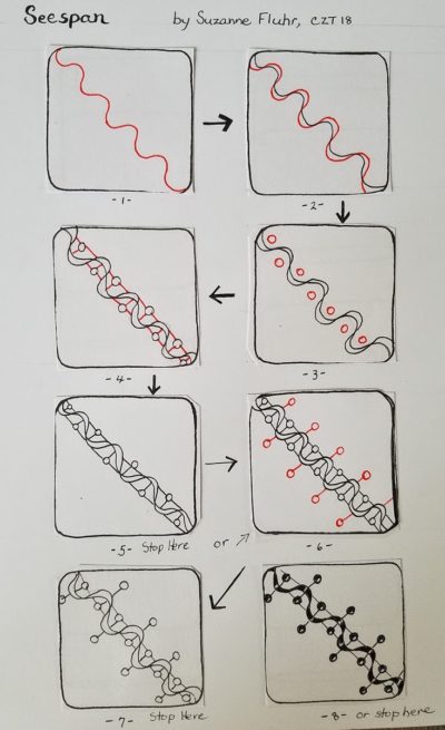 Below are the step outs for Seespan. I’ve illustrated 8 steps, but the basic tangle is shown in 5 steps. Personally, I most like how it looks after step 8.