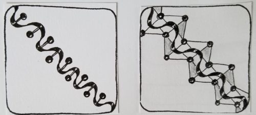 In the two examples below, on the left is a shaded version of Seespan without the sides of the “ladder”. On the right is an additional tangleation beyond step 8 where I’ve connected the orbs on each side, giving it the stepped effect.
