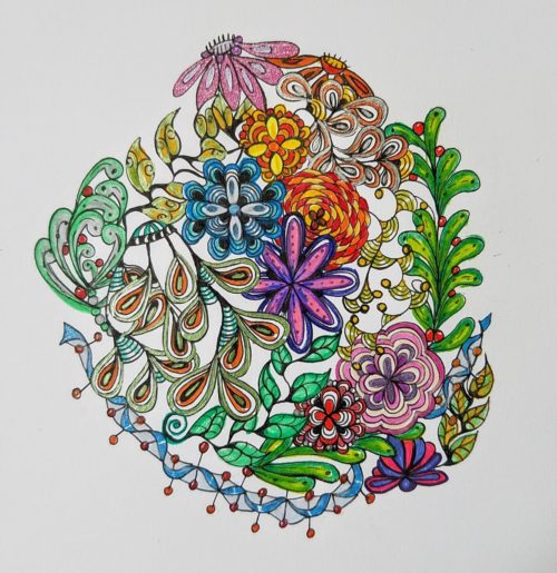 Finally, here’s some Zentangle Inspired Art, a ZIA, incorporating Seespan along the bottom. In a fit of self promotion I’ve incorporated two of my prior tangles, Aloha and 2 versions of Dinoflor. Flux and Mooka are also discernible. The “flowers” are probably also tangles, but they just appeared out of my head, so I’m not sure of the names. If you recognize them, feel free to share their names in a comment.